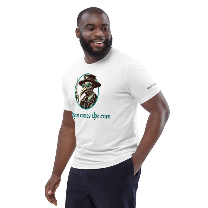 Le t-shirt "Here comes the cure" met en scène un médecin sinistre, prêt à administrer une injection qui inspire la méfiance. Ce design dramatique illustre l’angoisse de l’époque face à des traitements souvent incompréhensibles et effrayants. Fabriqué en coton doux et confortable, ce t-shirt est parfait pour ceux qui aiment un style audacieux et sombre.